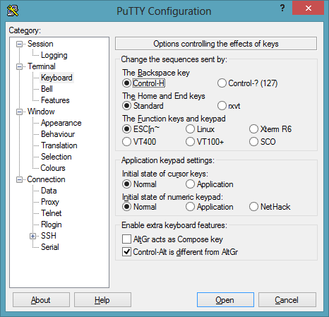 In my experience, I rarely have trouble with my Backspace or Delete key in PuTTY, however depending on the environment you are connecting to it may produce… unexpected results. Fortunately the backspace behavior can be modified under the Terminal -> Keyboard settings: