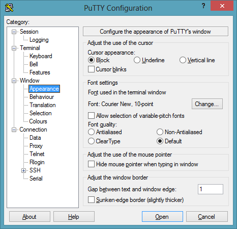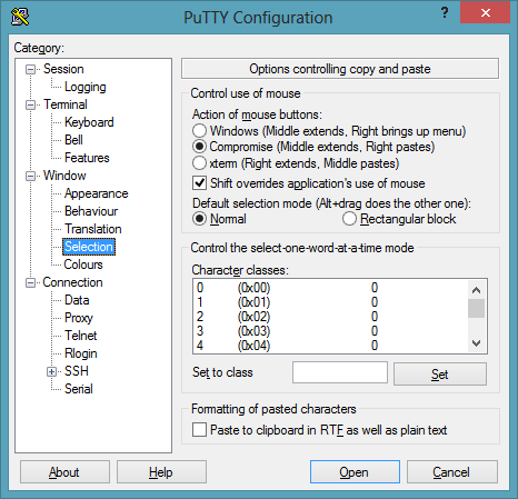 A little known feature of PuTTY that is handy from time to time is the ability to select text either on a word and line oriented basis (the default–and in my opinion preferred–behavior) or as a rectangular block (reminiscent of the traditional Windows Command Prompt). I recommend leaving the default behavior as “Normal”, because all that is necessary to select as a rectangular block is to hold down the “Alt” key while dragging the mouse: