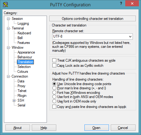 The first thing to check in PuTTY is to verify that the Remote Character Set is UTF-8 in the PuTTY configuration under Window -> Translation screen, and also make sure PuTTY is set to “Use Unicode line drawing code points.”