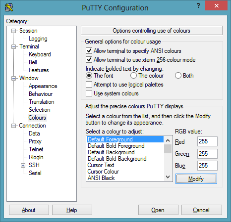 In my experience the classic gray text on a black background terminal is a difficult color combination to read because the color contrast is simply too low. After experimenting with several color combinations, I’ve found that a midnight blue background with bright white text has the right contrast and is much easier on the eyes. This can be set from the Window -> Colors dialog: