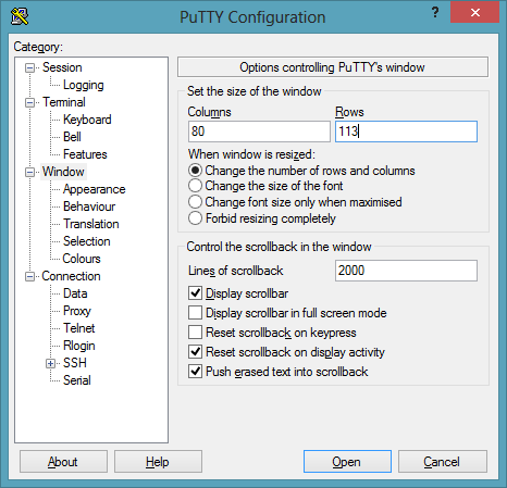 Have you found that the default terminal size of 80 columns by 24 rows to be confining? This was the traditional size of a VT100 terminal, but today on a Windows desktop there is not much reason to restrict the window to this size. A single command might scroll several pages of text with only 24 rows available, so I set PuTTY to default to a maximum number of rows for my display: