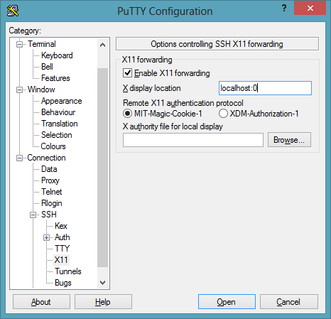 Among new users of PuTTY, there is often a misconception that since PuTTY does not include an X server, it cannot be used with X11 applications. The reality is that PuTTY is already able to forward X11 connections to a local running X server with minimal configuration. In fact, all that is needed is to make a couple of simple changes in the PuTTY Configuration under Connection -> SSH -> X11 as in the following example: